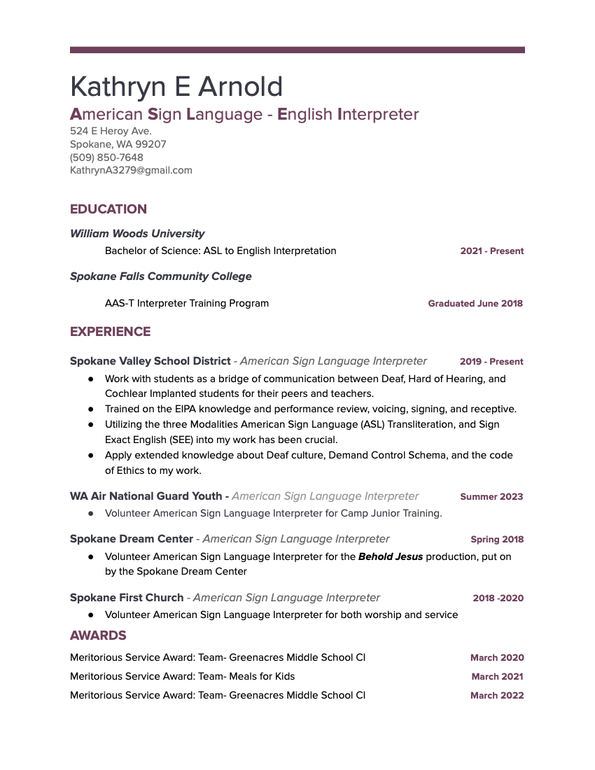 Hello my name is Kathryn Arnold, but I go by Katie for short. I was born, raised, and am fortunate that I also get to work in the beautiful pacific northwest region, specifically the city of Spokane Washington. I first fell in love with American Sign Language (ASL) as an undergraduate at SFCC (Spokane Falls Community College) where I completed my AAST and started my journey as an ASL Interpreter. Right out of college I was hired on by a local school district where I am tasked with being a full time interpreter, primarily working with middle and highschoolers.